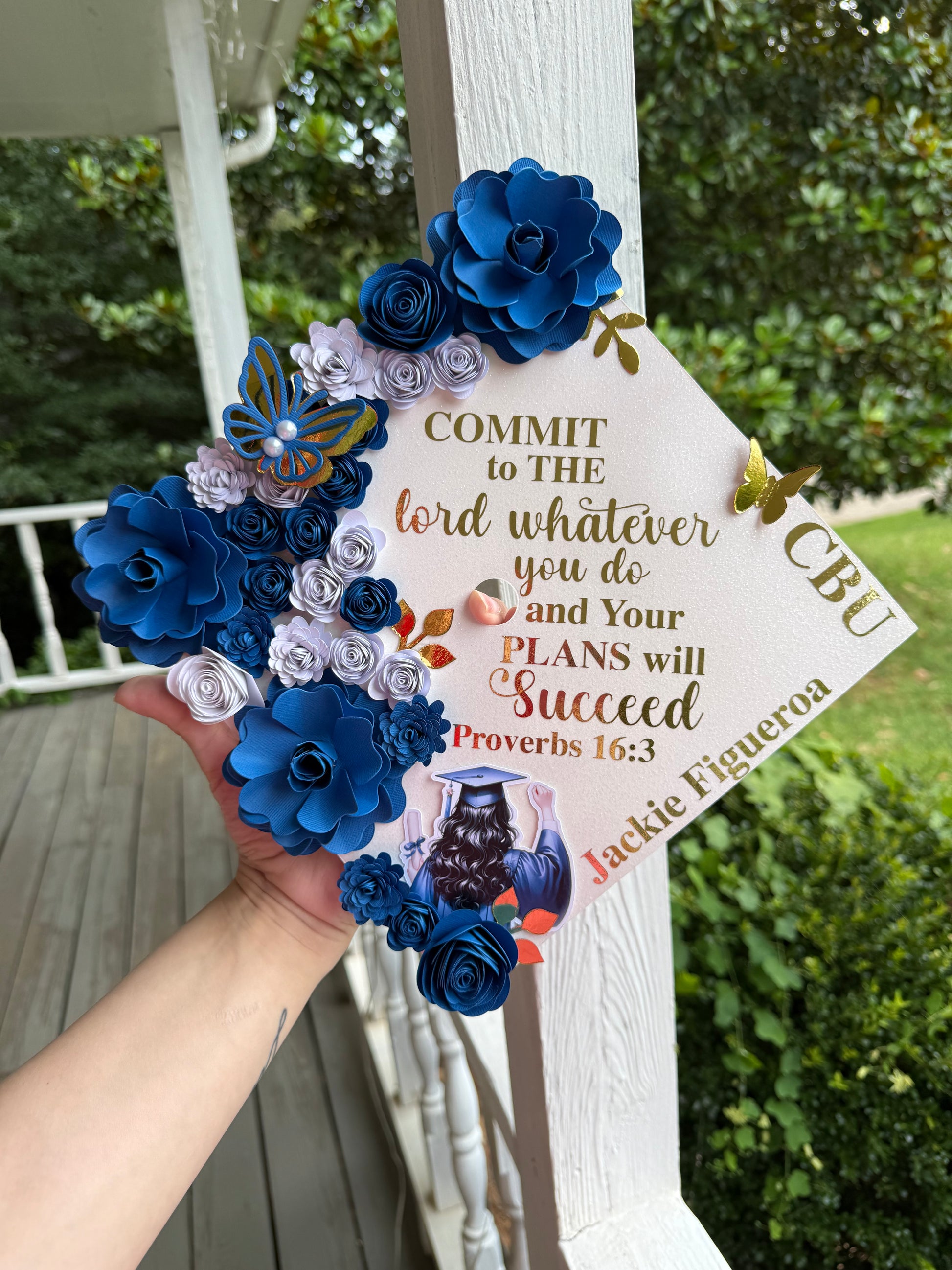 🎓 Custom Graduation Cap Topper – Proverbs 16:3 Design 🌸